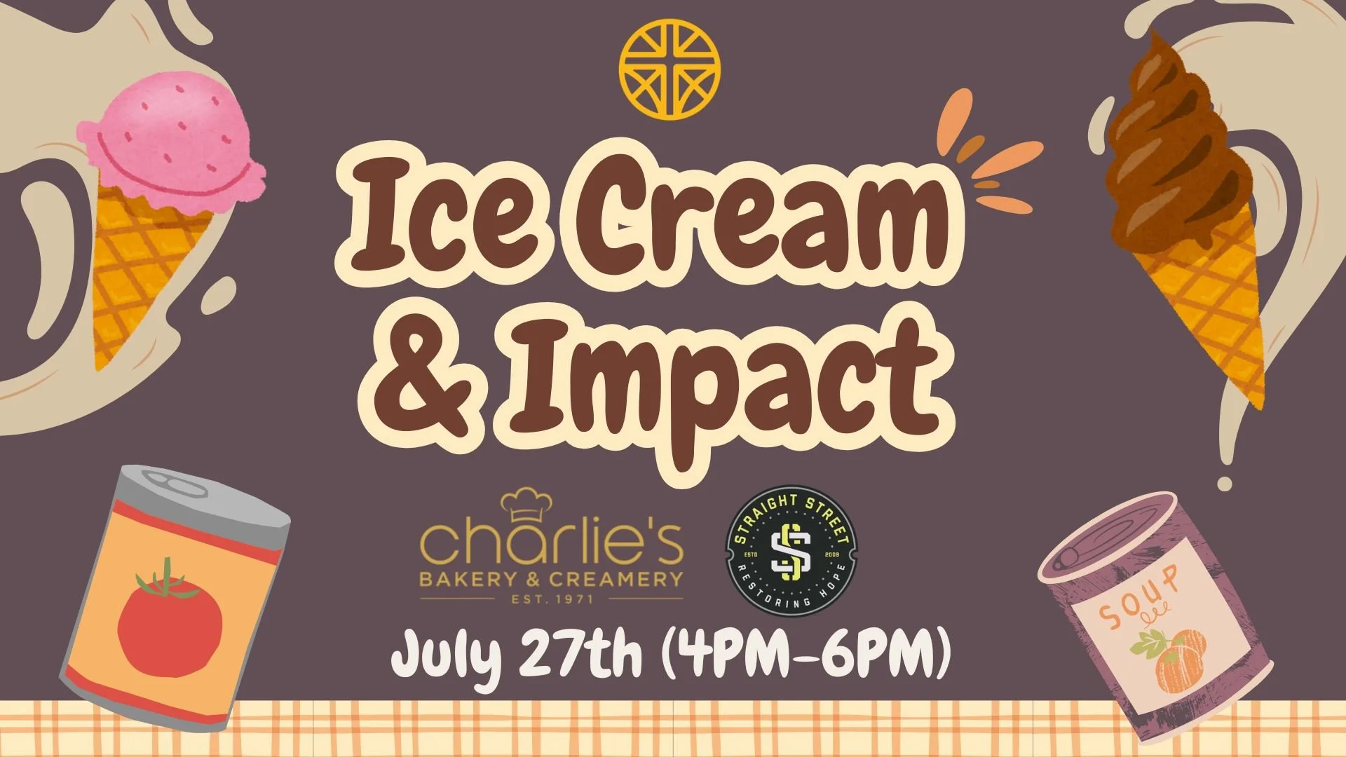 We’re excited to partner with local churches to support small businesses and meet the needs of our community. Join us this coming Sunday, July 27th at Charlie’s Bakery on Curry Ford from 4 PM to 6 PM for a time of connection and community impact! We’ll also be collecting canned goods and non-perishable items outside the ice cream shop. All donations will go to Straight Street, one of our partner ministries working to serve those in need.